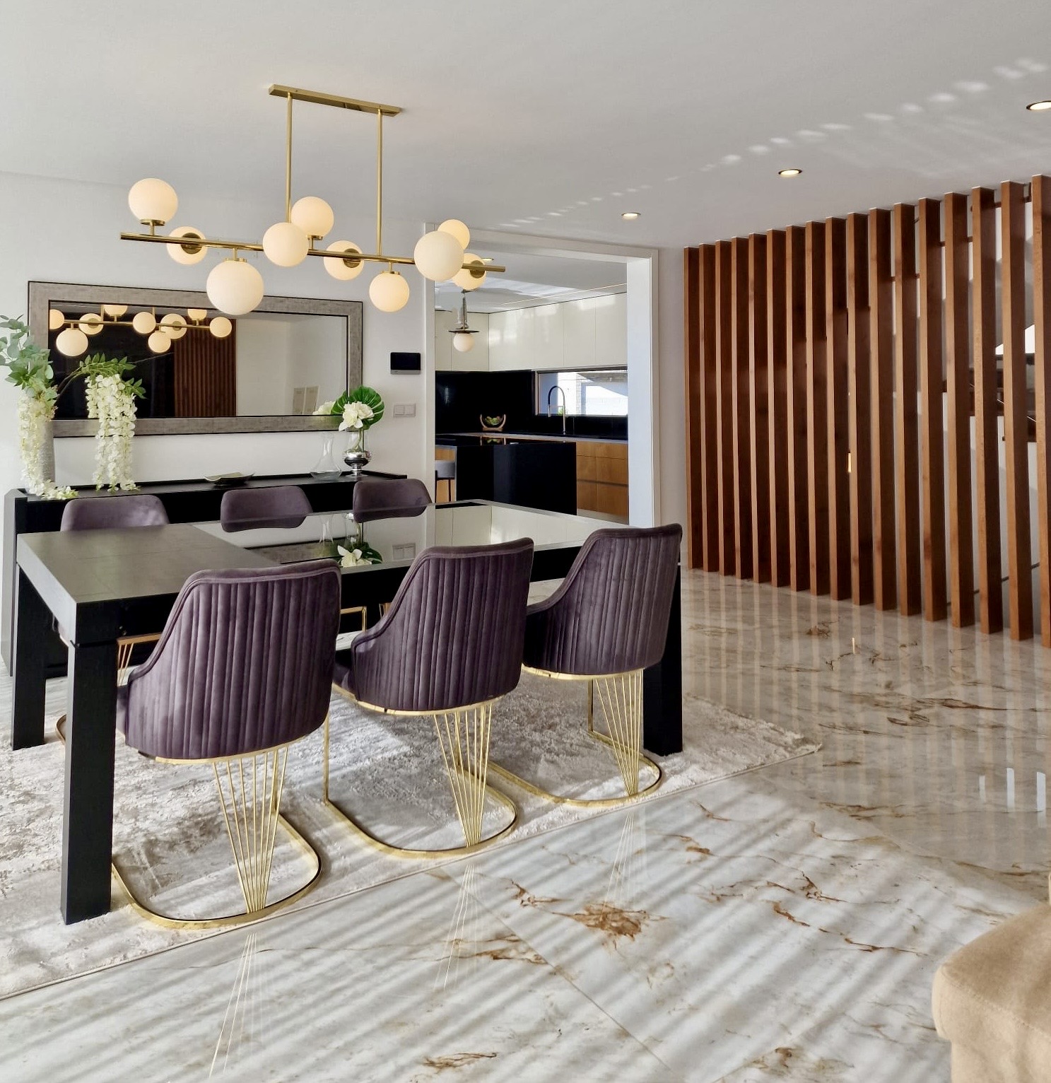 In our living room we have a large 75-inch TV with an external Bluetooth speaker system Consequently, we ensure everyone’s entertainment, comfortable sofas, and translucent motorized curtains to allow sunlight in.